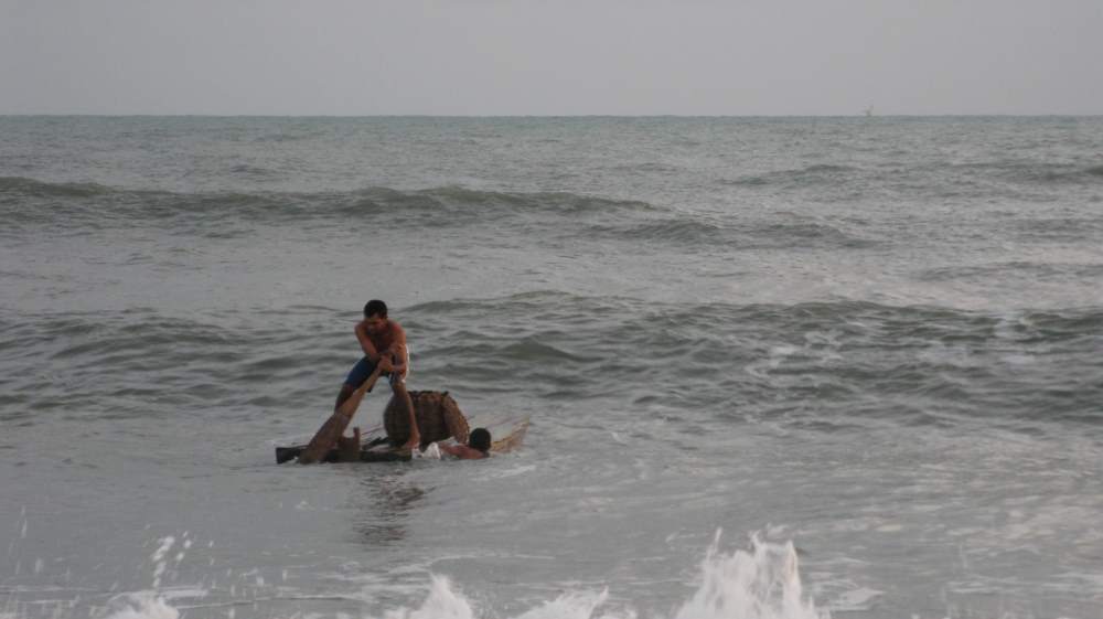 Sculling a bote through the surf.