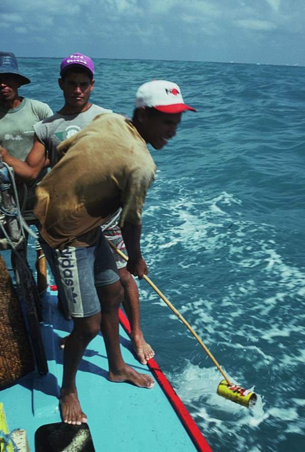 Wetting the Sail Published July 20, 2015 at 600 × 888 in Glossary Neu is bending down to scoop up seawater with the aguador. This one is made from a one liter cooking oil can.